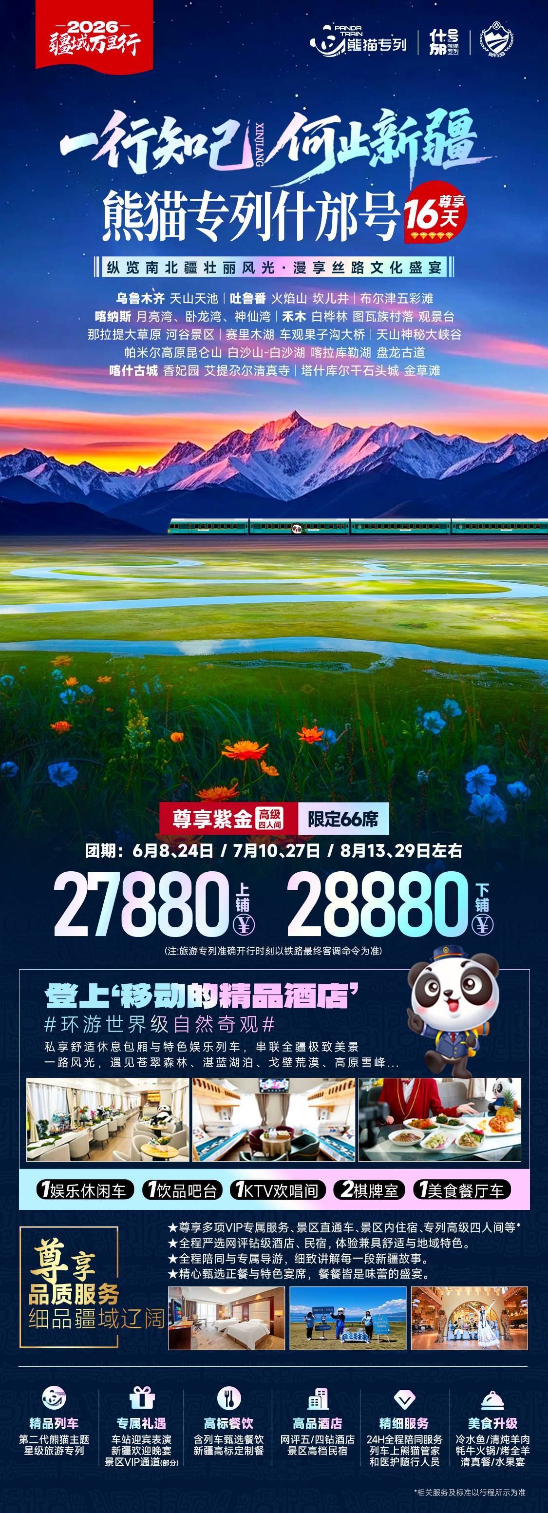 熊猫专列什邡号16天行程纵览南北疆:从北疆的草原、湖泊(如喀纳斯、禾木)到南疆的丝路古城(如喀什、库车),穿越独库公路、天山花海等标志性景观,感受新疆的多元之美。